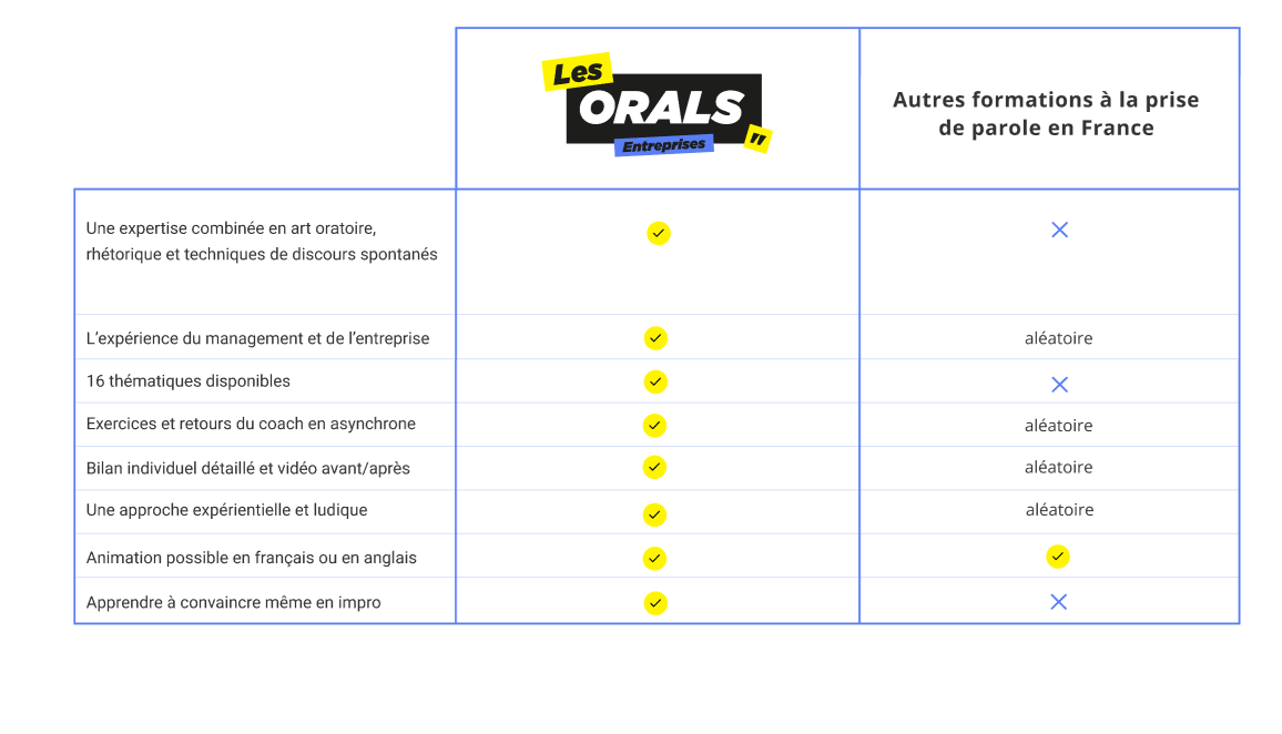 D’abord : tous mes déroulés pédagogiques sont construits sur la base d’exercices rhétoriques concrets, se rapprochant des contextes de votre vie professionnelle. Ensuite, je m’assure que tous ces outils soient rapidement applicables par vos équipes.